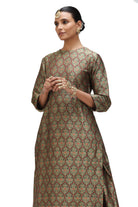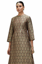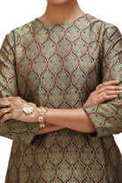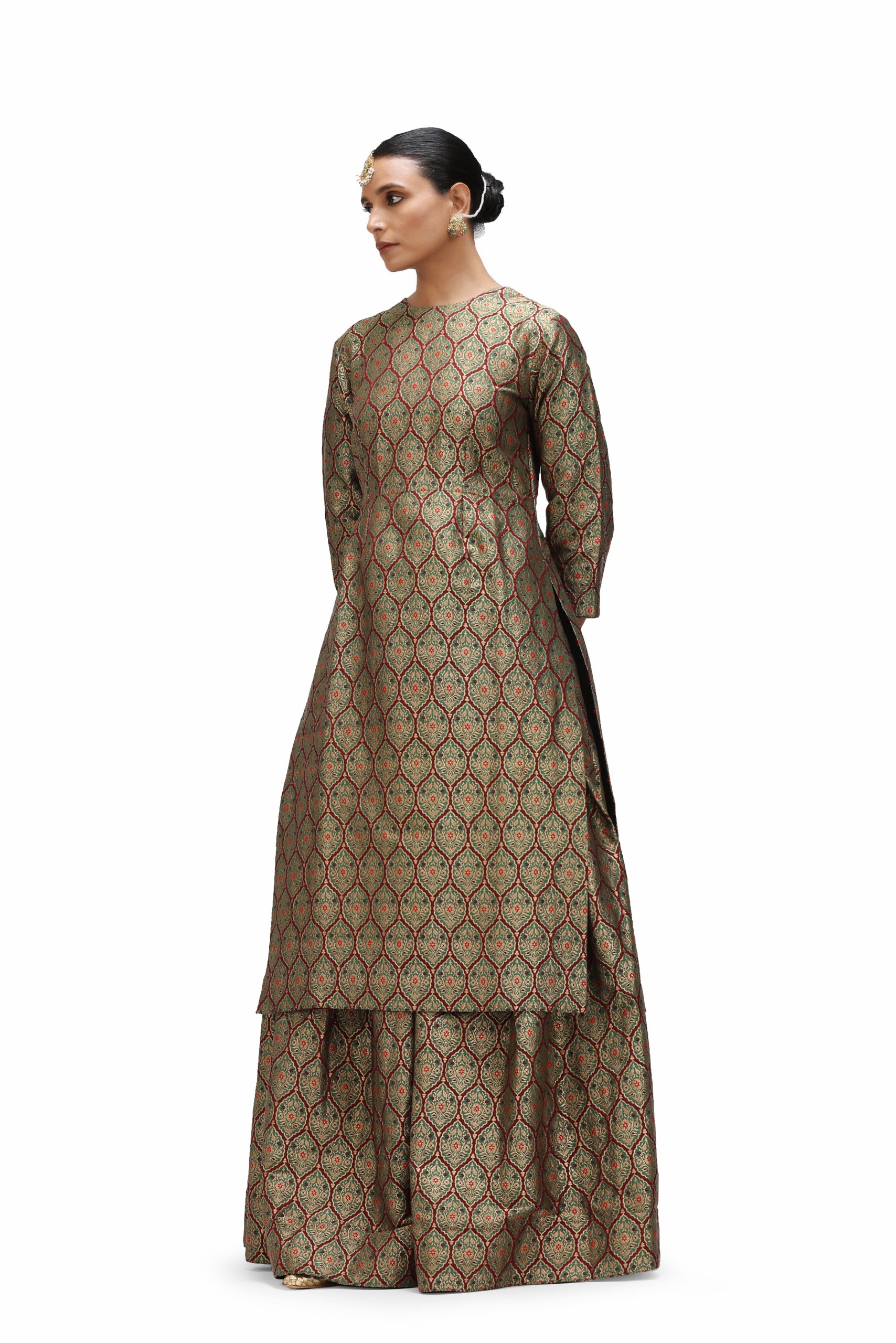 Asma is a hand woven brocade kurta paired with coordinated ghaghra pants. The textile has garnet 'zameen' with 'alfi' motifs in deep green and gold.