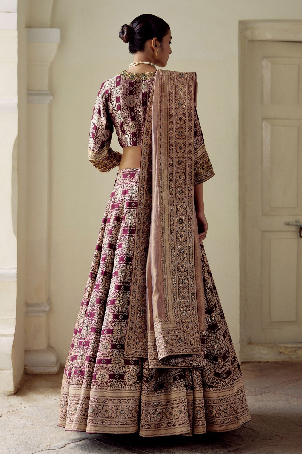 Intricately handwoven lehenga set paired with dupatta.