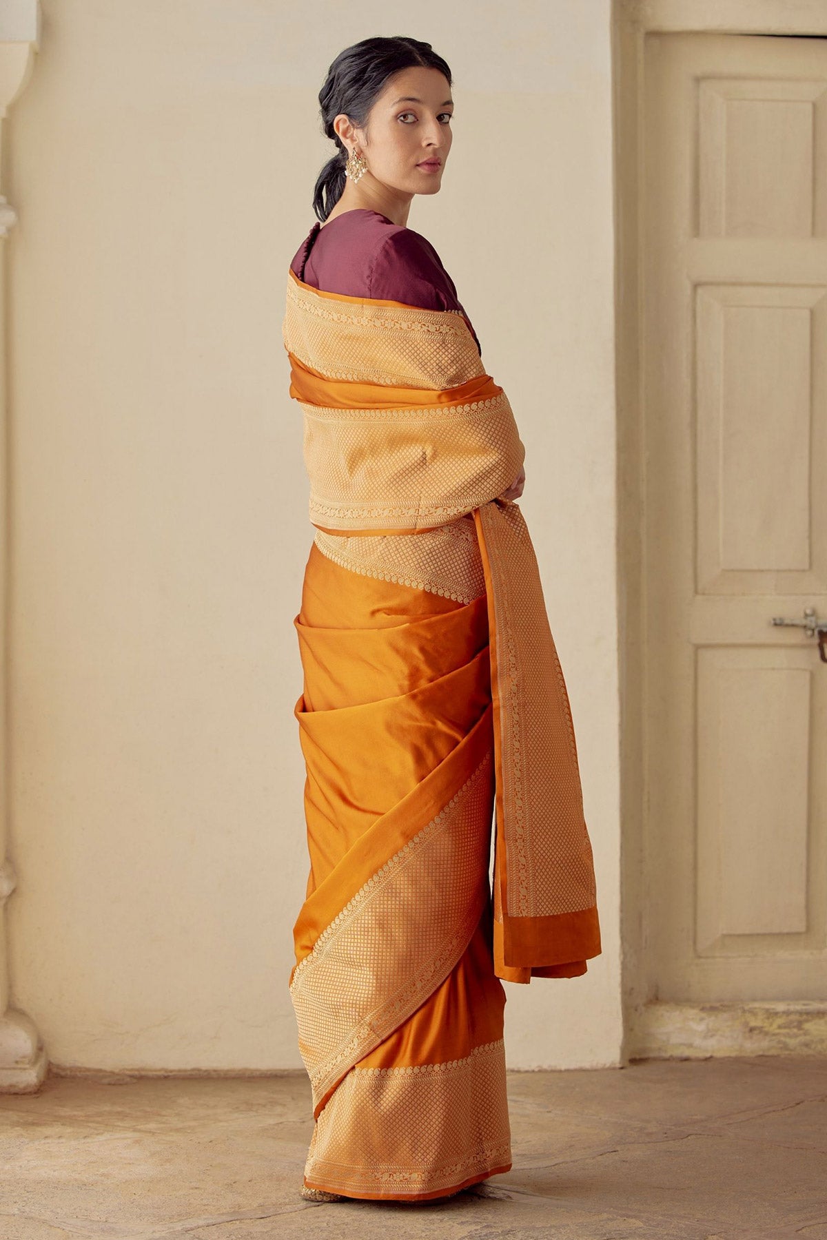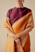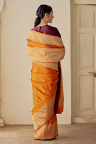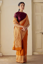 Intricately handwoven saree in burnt orange.