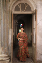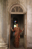 Hand crushed gogo printed hand embroidered ruffled saree.