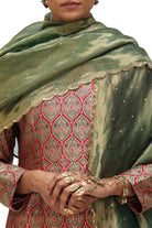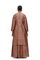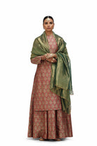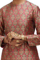 Ziba is a hand woven brocade kurta paired with coordinated pants. The textile has garnet 'zameen' with 'alfi' motifs in green and gold.