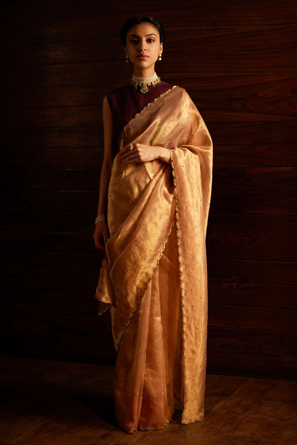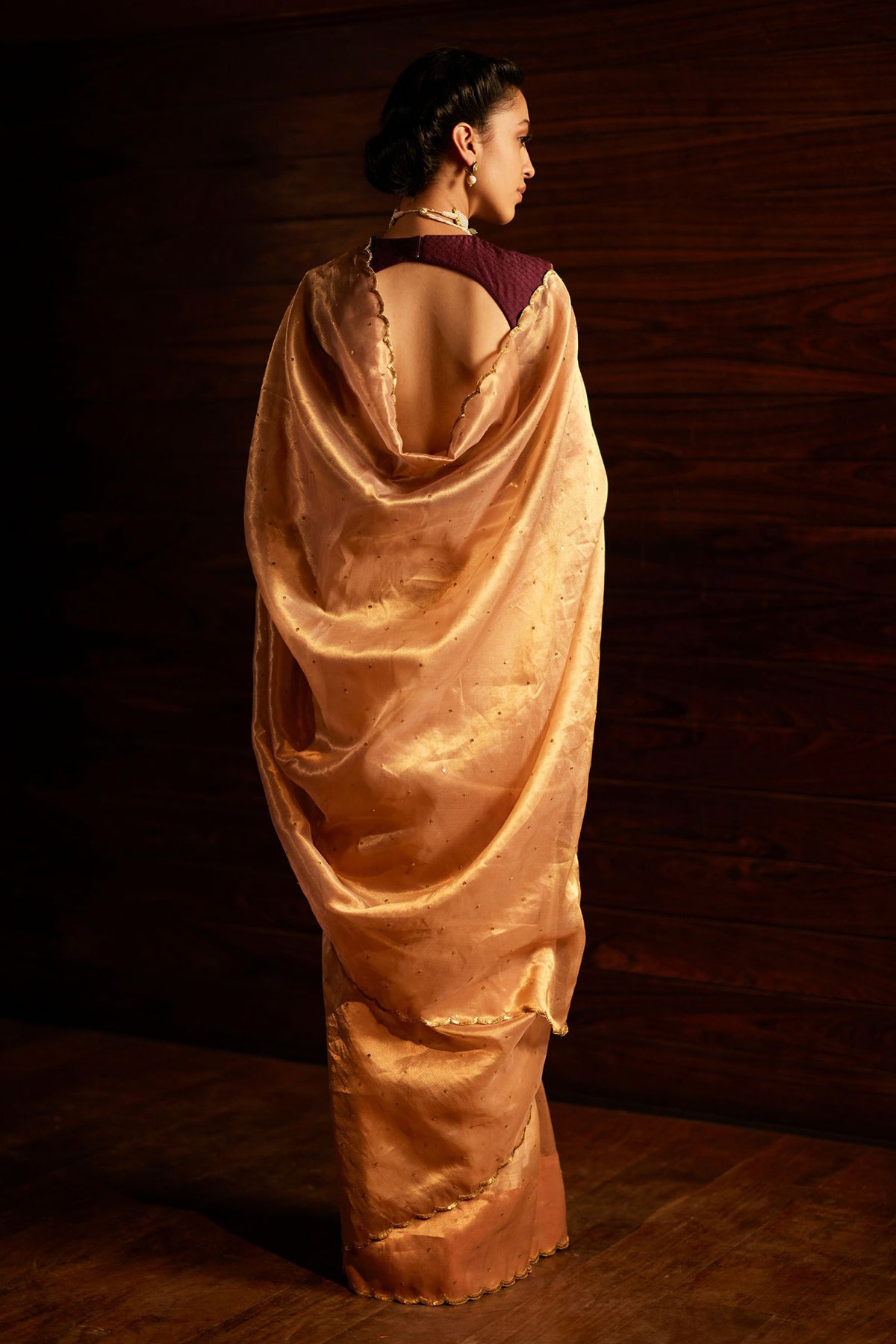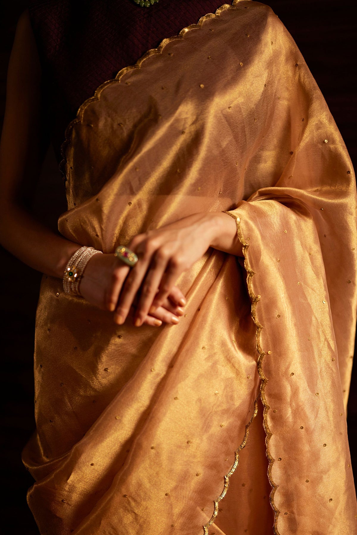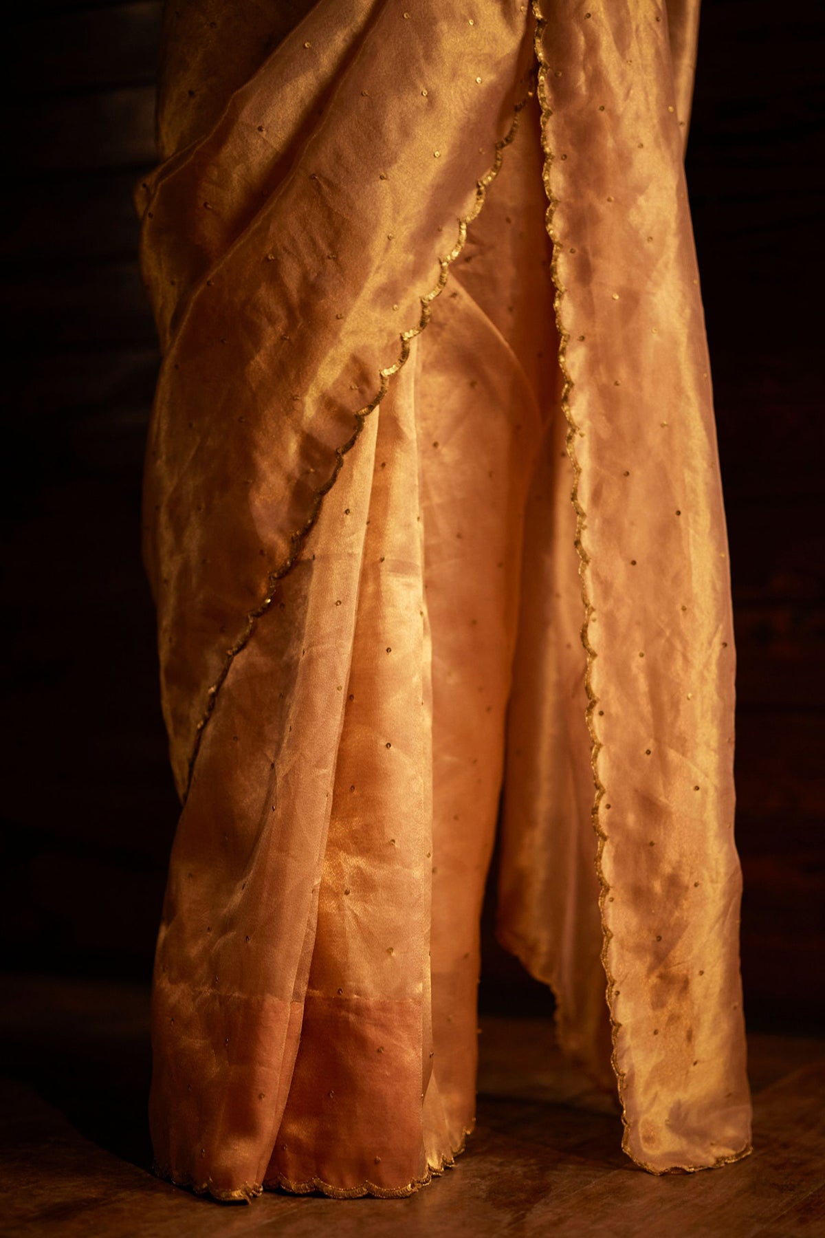 Intricately handwoven saree in golden.