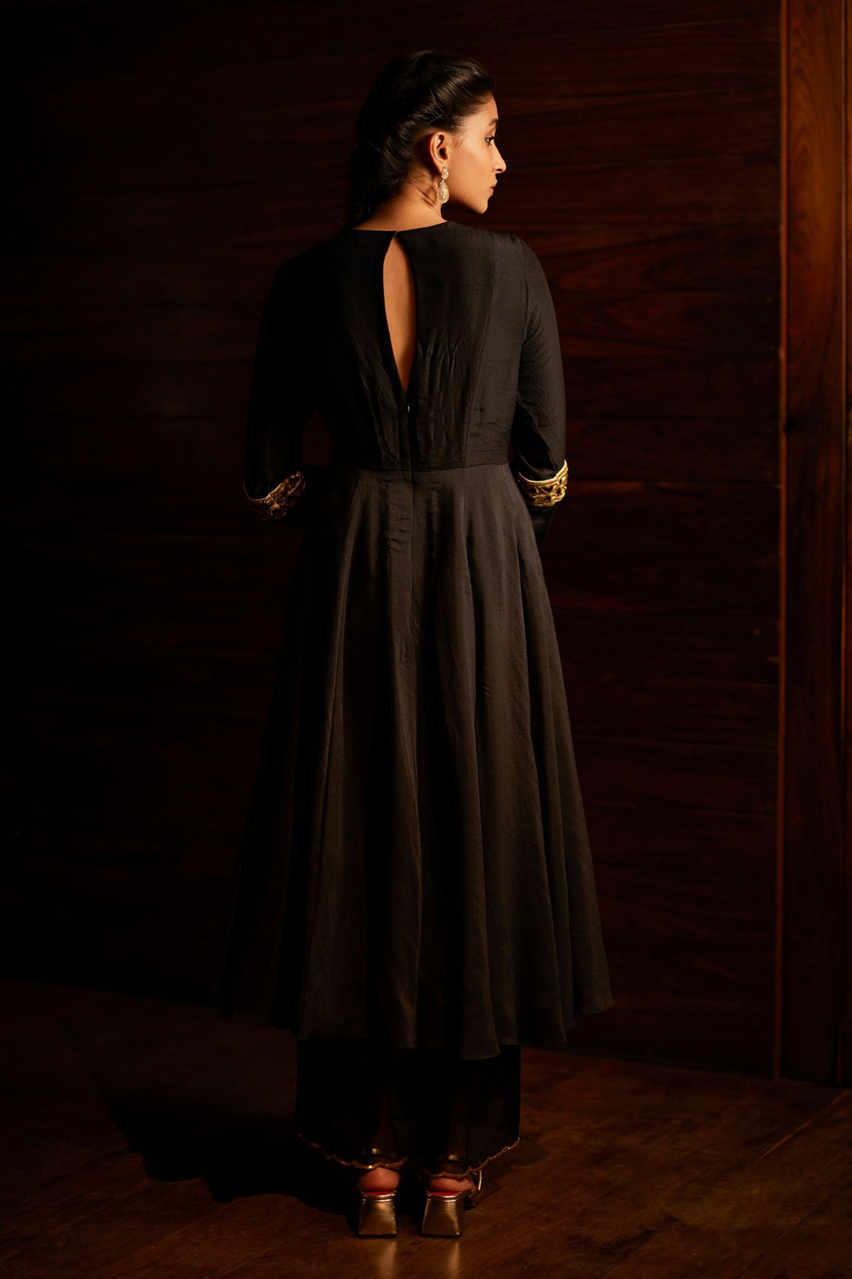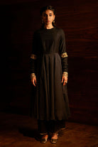 Intricately handwoven anarkali set in charcoal paired with Dupatta in ivory.