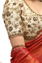 Gulnar is an ivory stitched blouse featuring real brass 'tiki' floral storyline on quilted munga silk fabric.