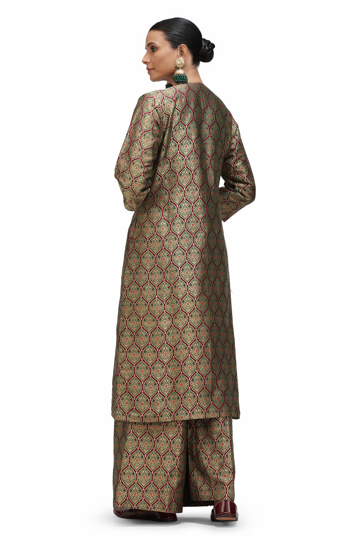 Krishna is a hand woven brocade kurta paired with coordinated pants. The textile has magenta 'zameen' with 'alfi' motifs in deep green and gold.