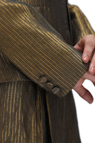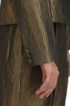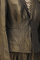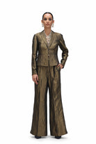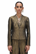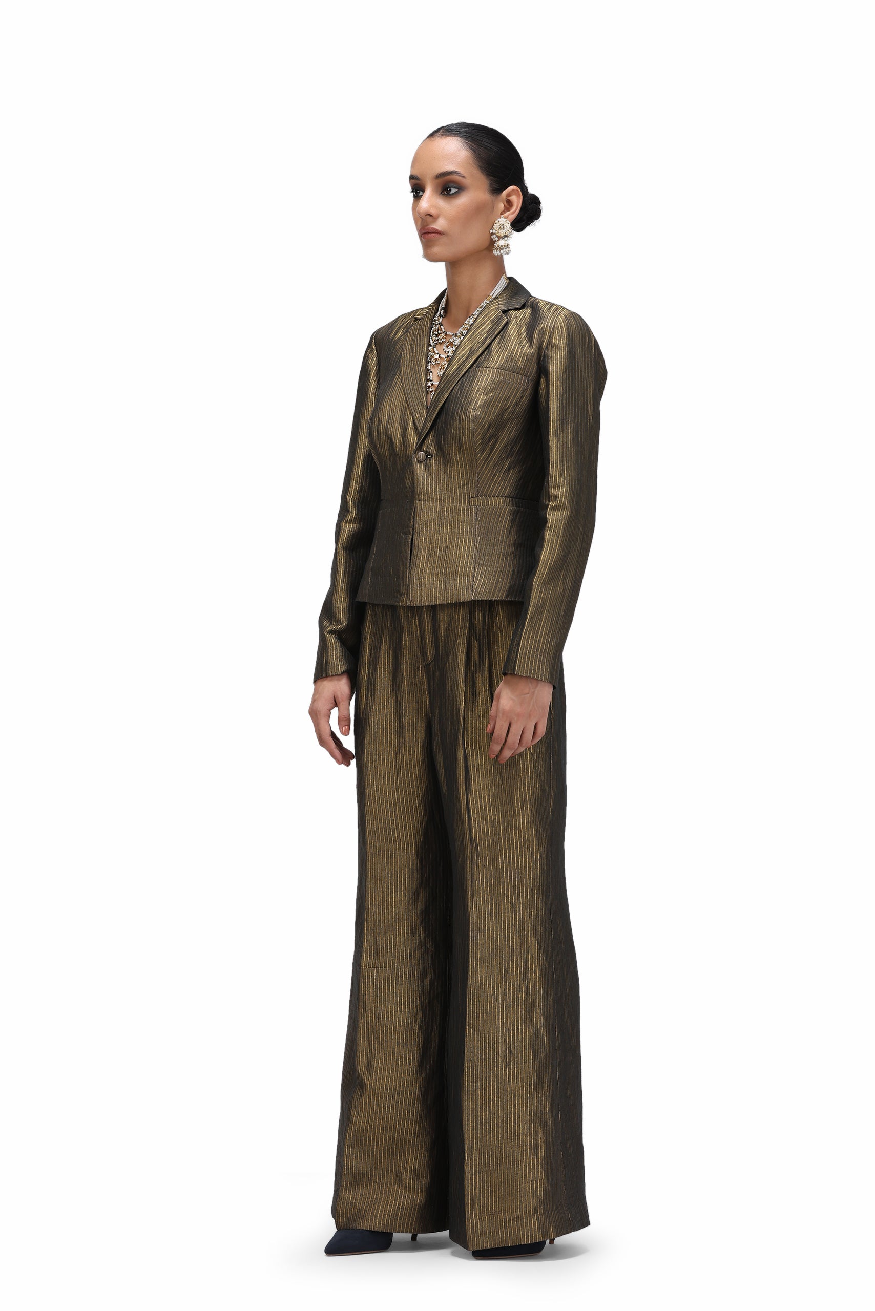Almas is a single-breasted charcoal blazer in munga silk with golden 'zardosi'. It is paired with flared coordinated pants.
