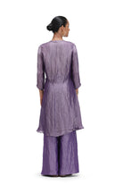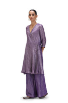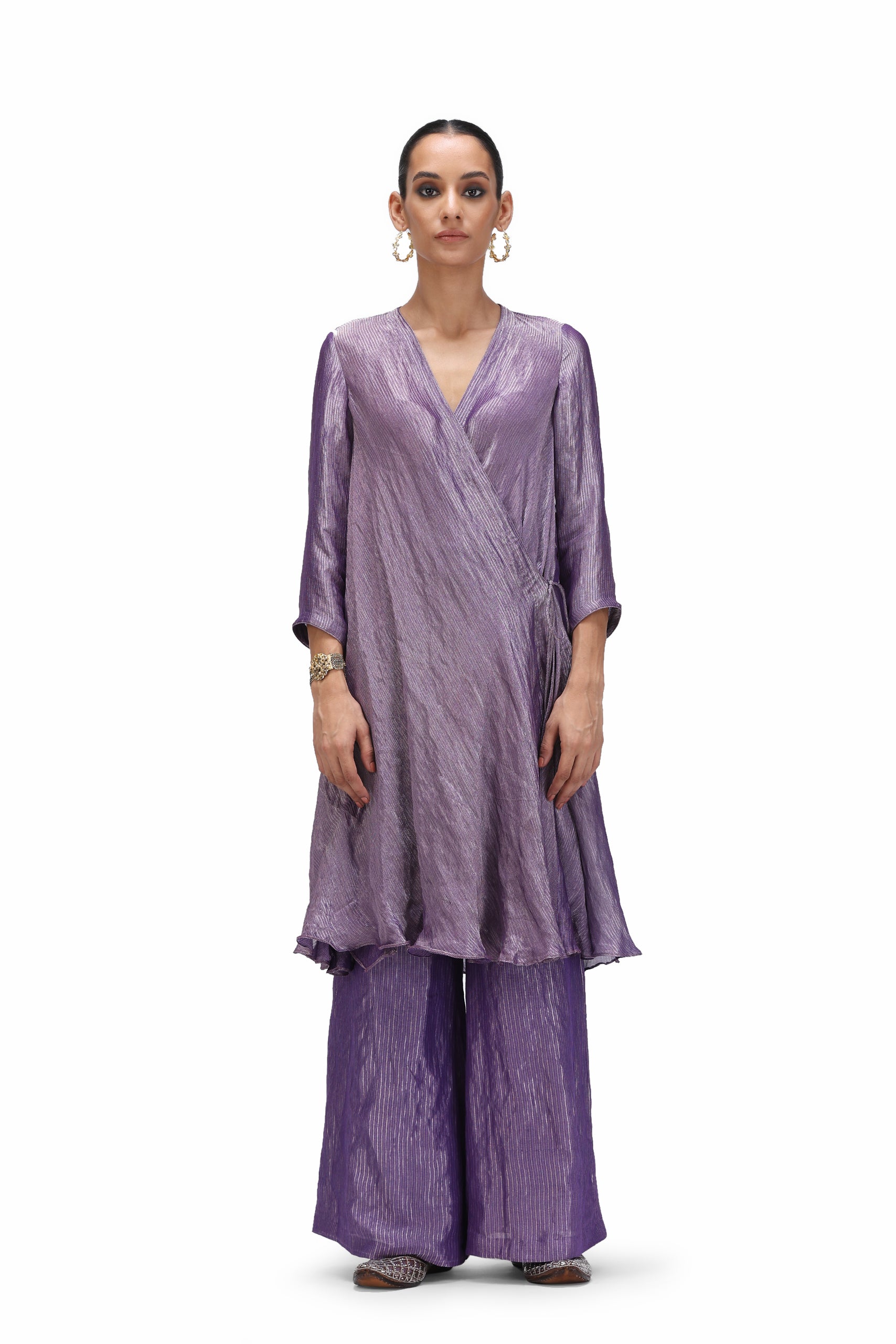Iya is an asymmetrical wrap style violet kurta in munga silk. The fabric features silver 'zari' work. It is paired with coordinated pants.