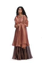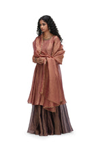 Jagvi is a woven crushed tissue silk kurta paired with coordinated garhara pants in garnet. The textile is naturally dyed in pale.