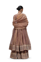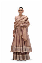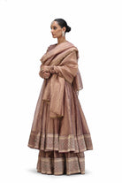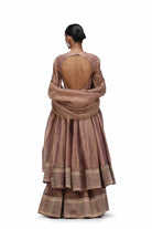 Triya is an 'anarkali' set in crushed tissue featuring a thick brocade border at the bottom of the kurta and coordinated pants.