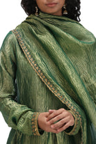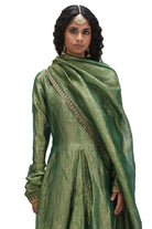 Yusma is a hand crushed tissue dupatta in green. The textile is adorned with real brass 'tiki' and 'resham' floral motifs at the edges.