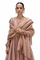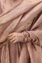 Xiti is a metallic dupatta in pale. The crushed tissue textile is scalloped with real brass 'tiki' at the edges.