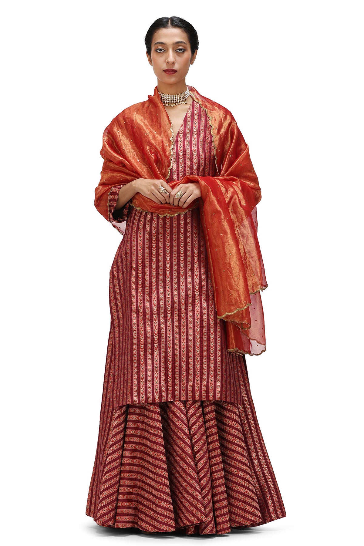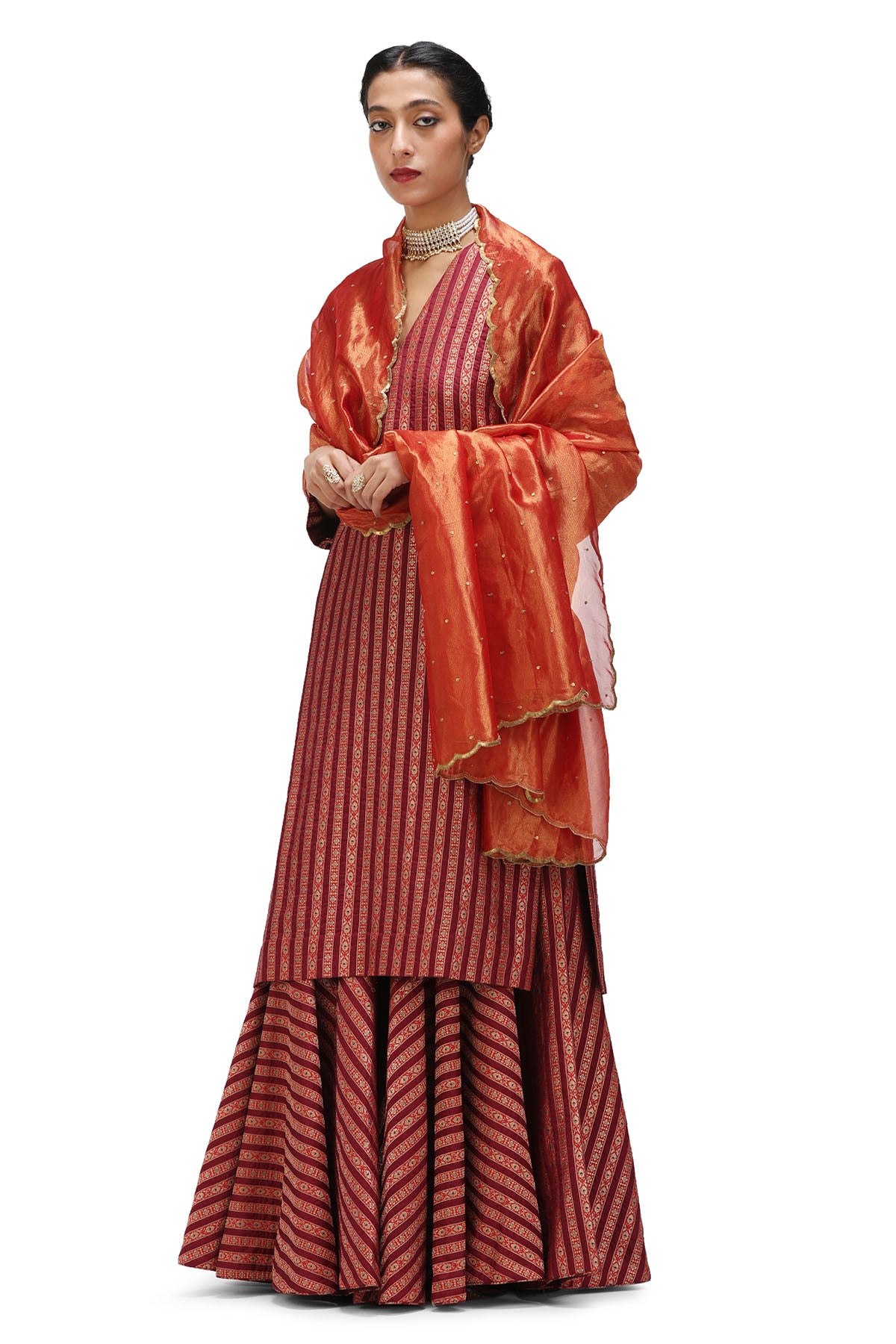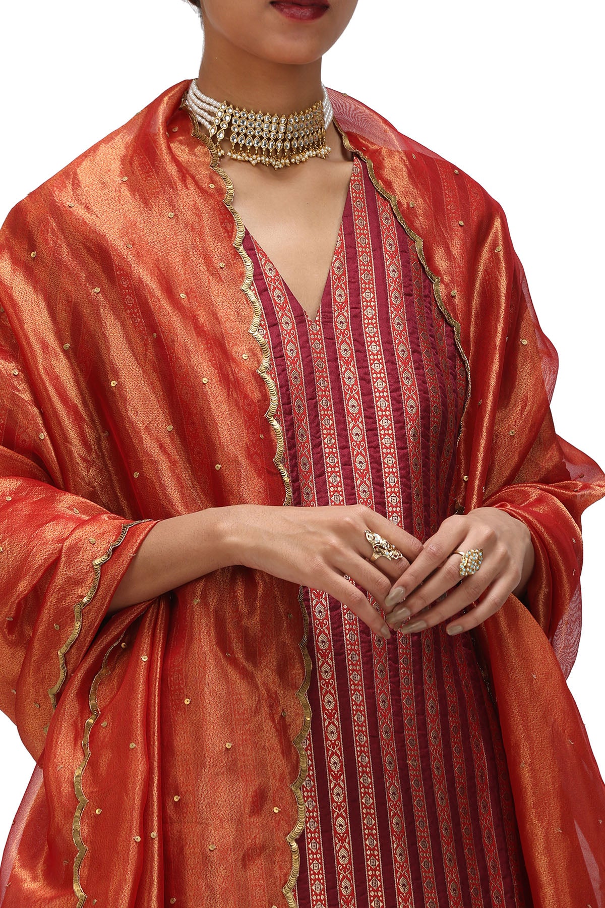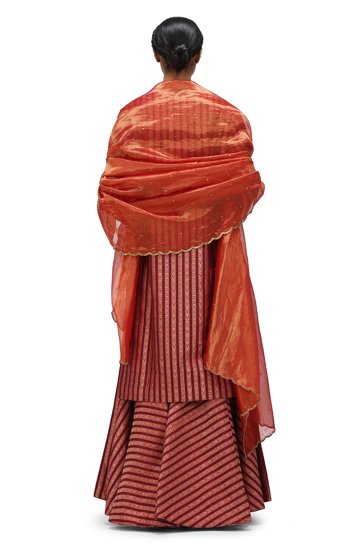 Amala is a flowy metallic dupatta in rust. The tissue textile is scalloped with real brass 'tiki' at the edges.