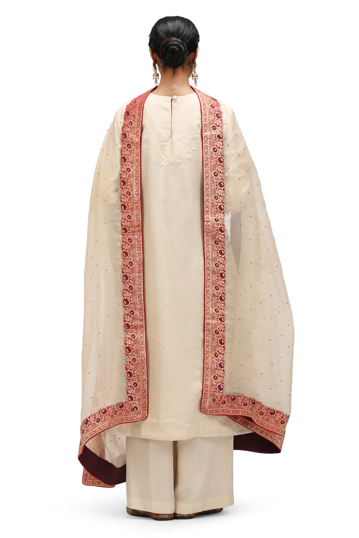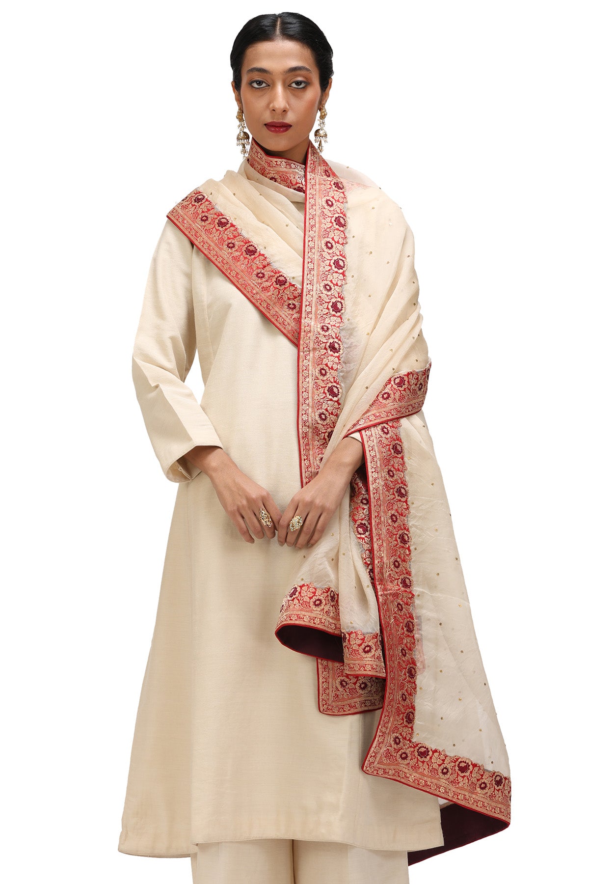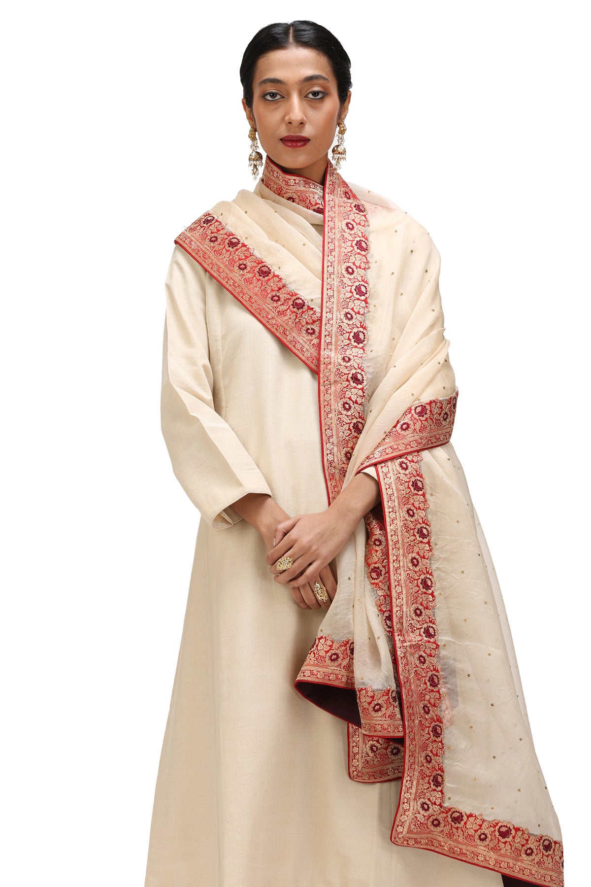 Deepa is a flowy matte dupatta in ivory. The organza textile is appliqued with hand woven brocade border.