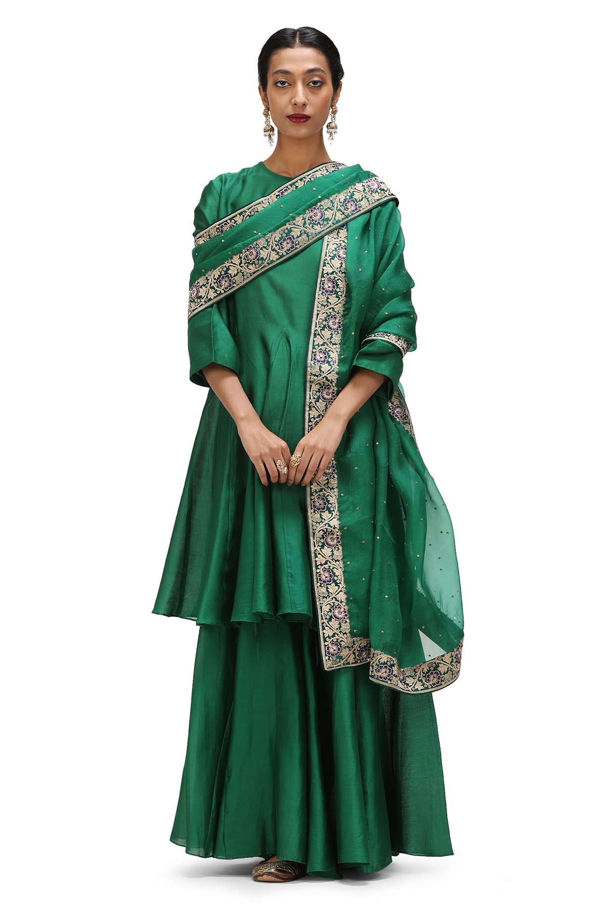 Jaida is a flowy matte dupatta in emerald green. The organza textile is appliqued with hand woven brocade border.