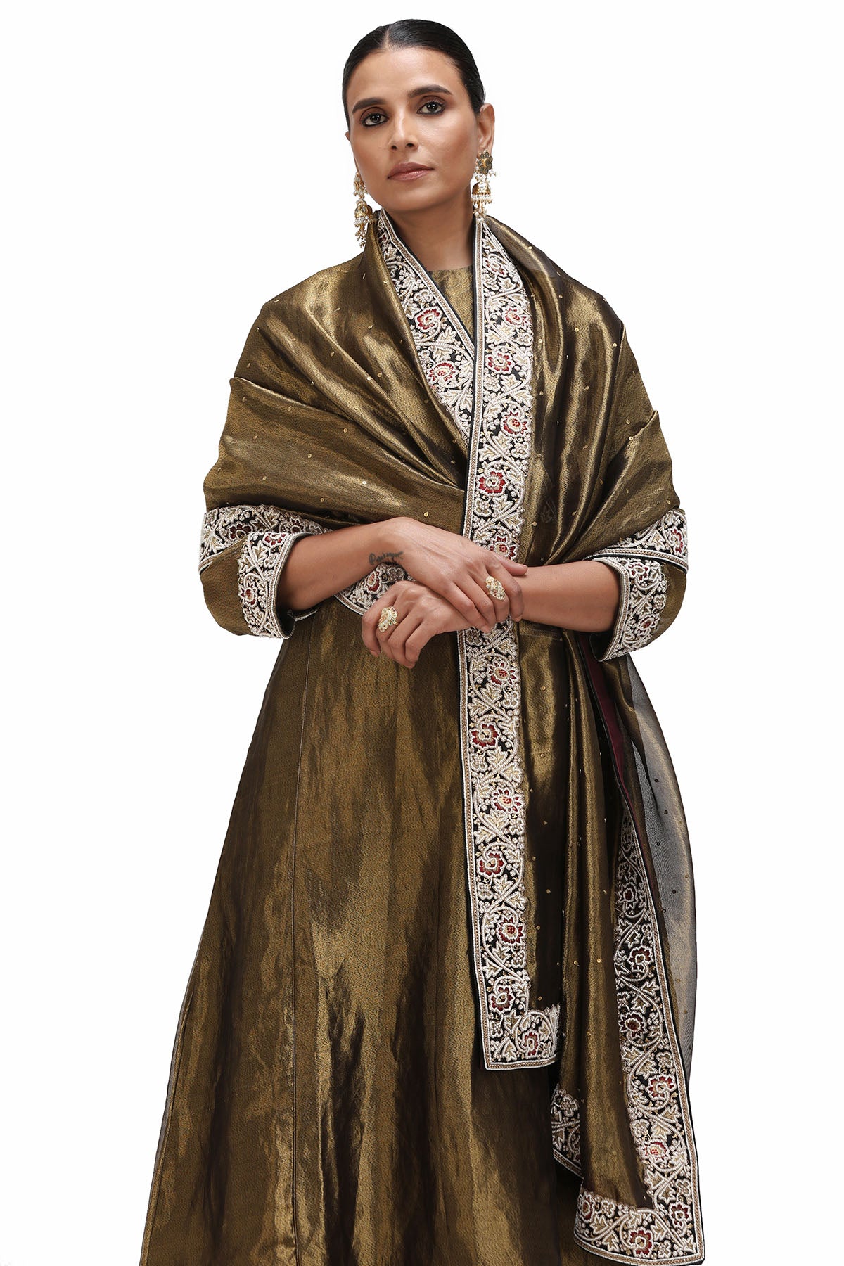 Nalini is a flowy metallic dupatta in charcoal. The organza textile is appliqued with hand woven and embroidered brocade border.