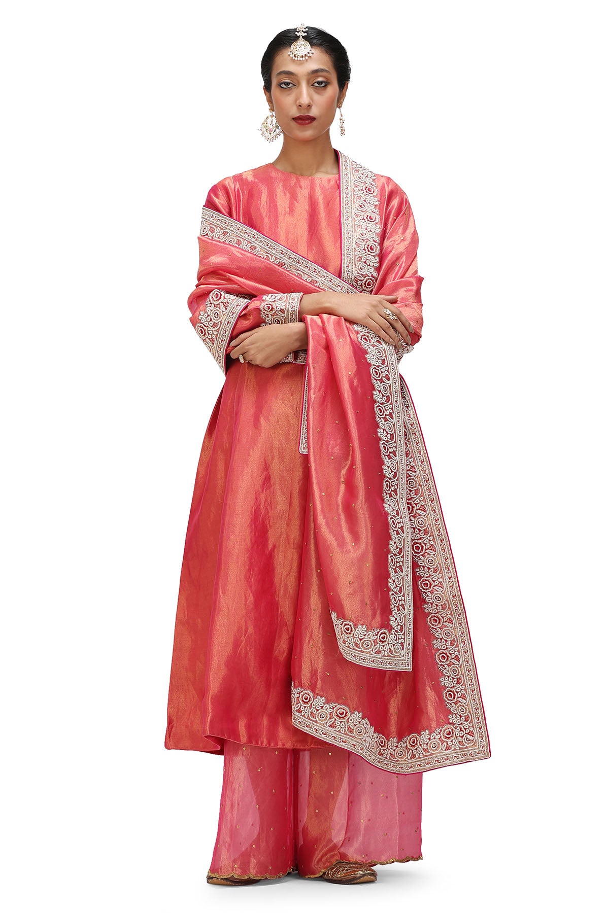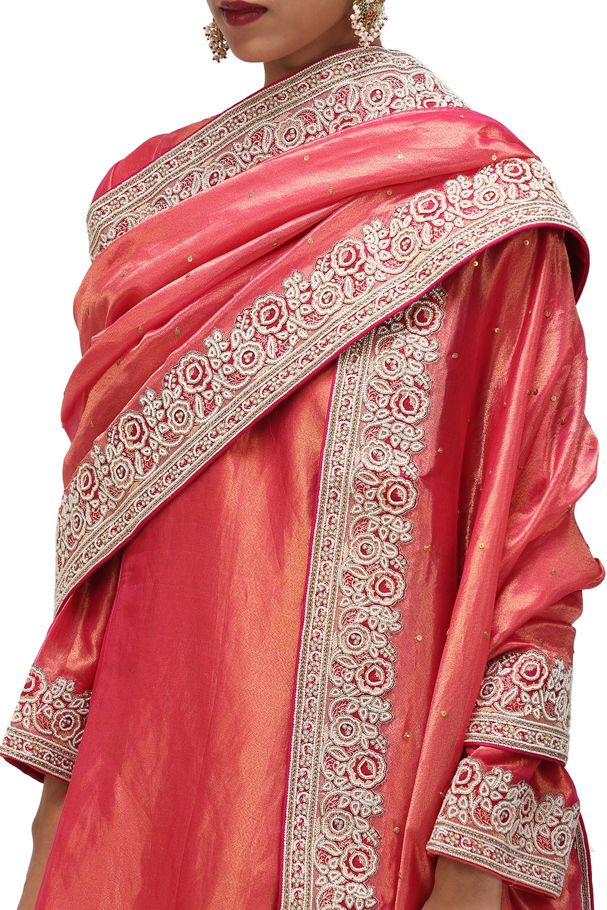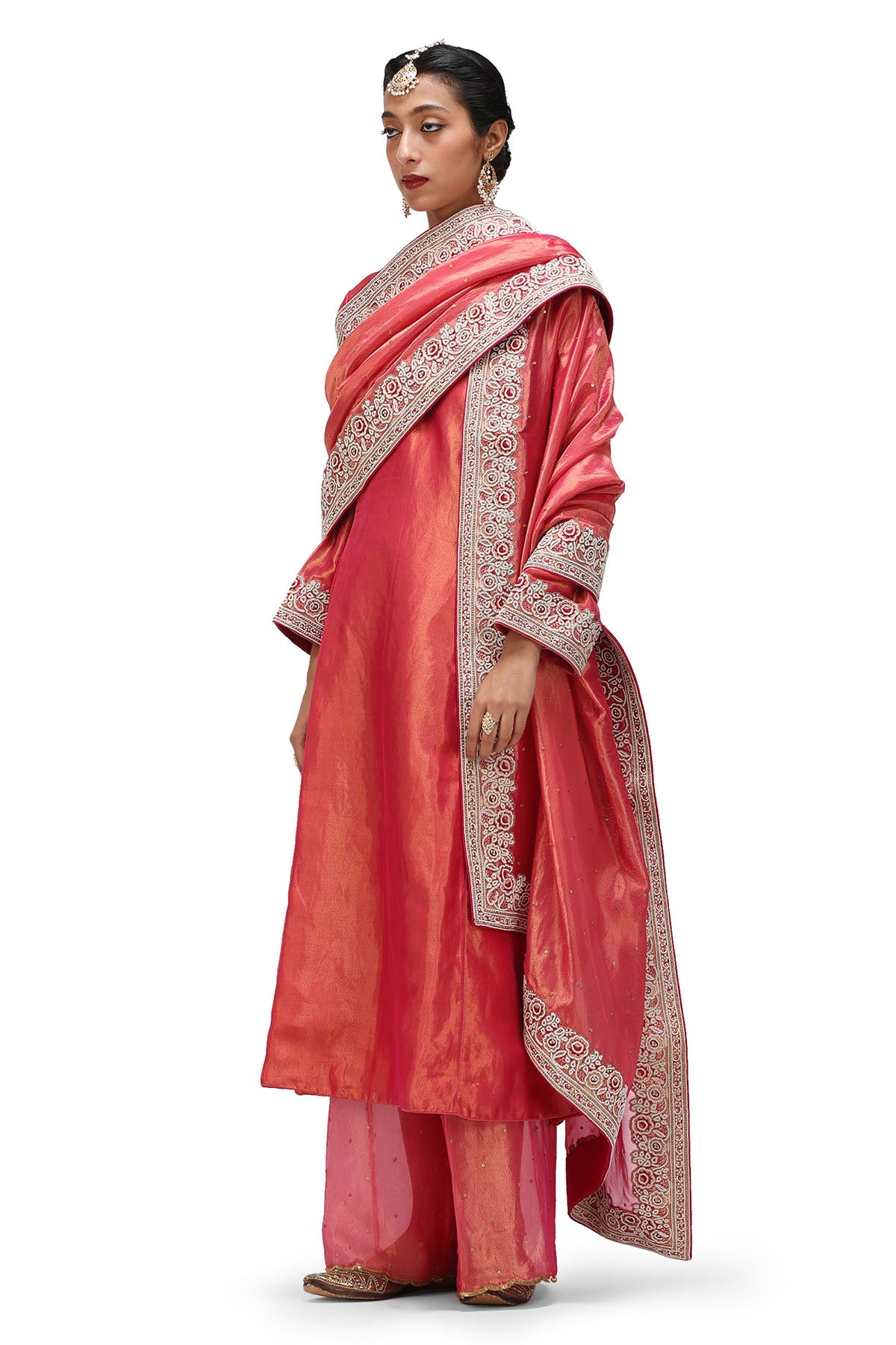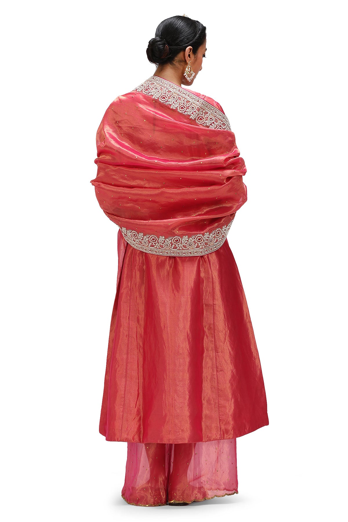 Sangeet is a flowy metallic dupatta in fuchsia. The organza textile is appliqued with hand woven brocade border.