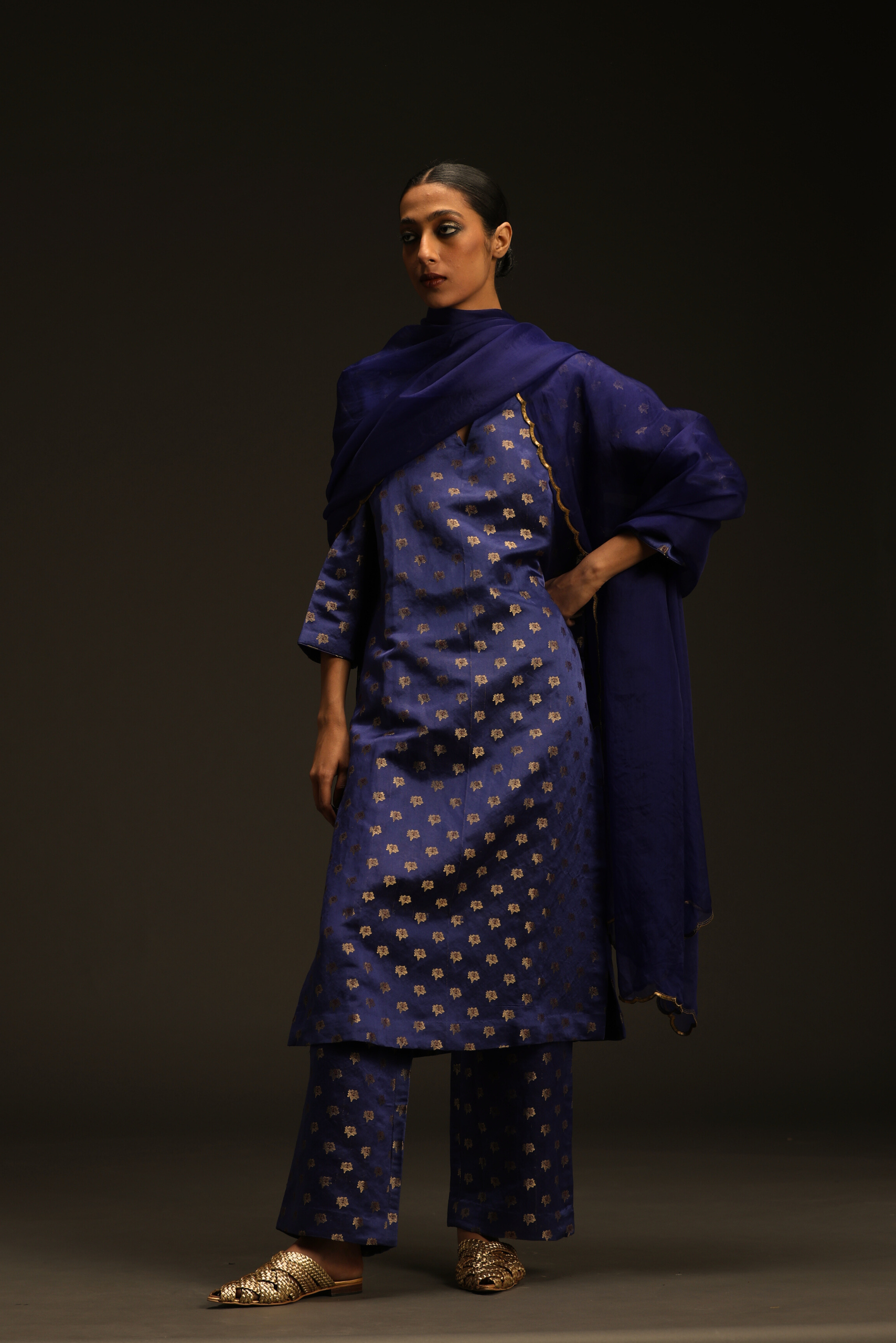 Intricately handwoven suit set paired with dupatta.
