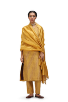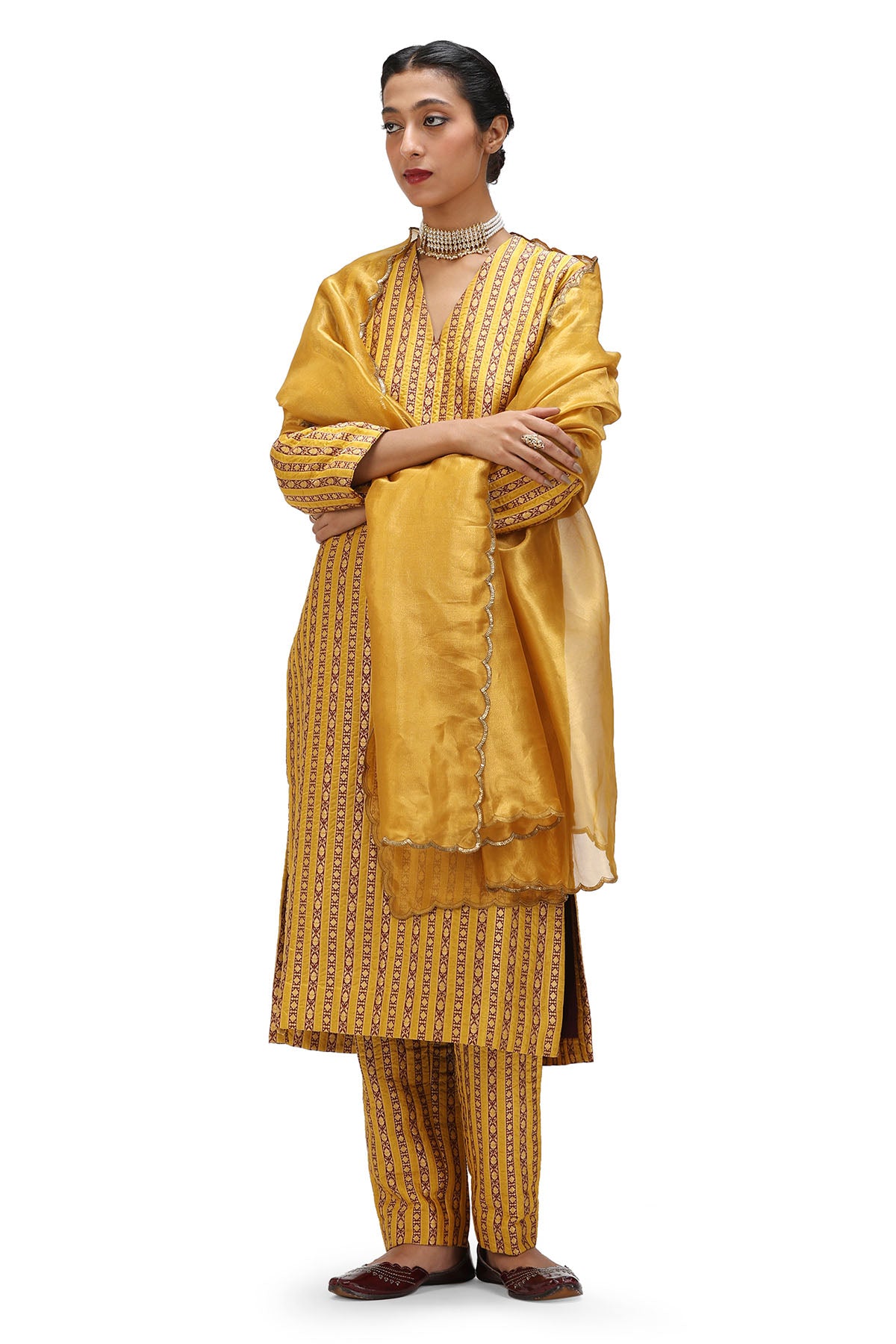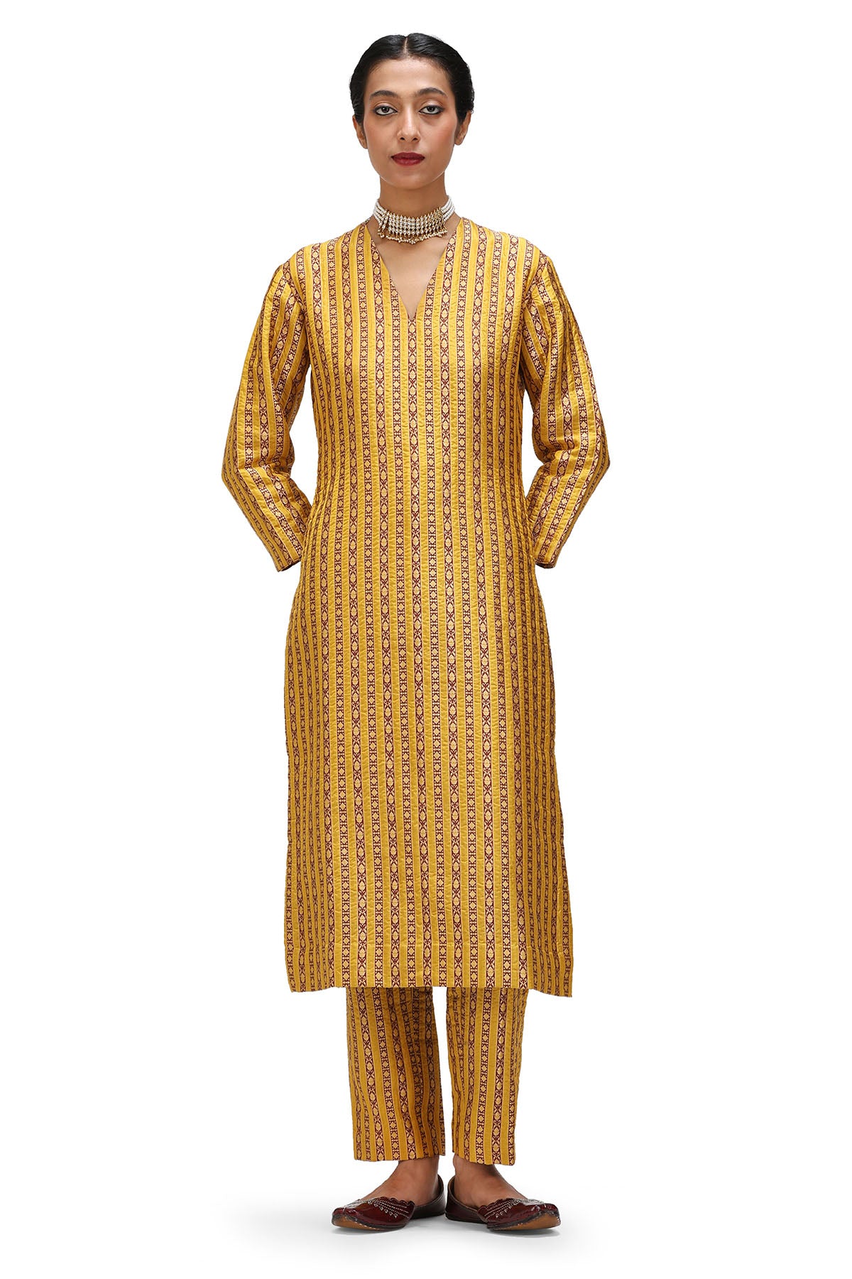 Lakika is a hand woven brocade kurta paired with coordinated pants. The textile has mustard 'zameen' with garnet and gold 'patti' brocade work.