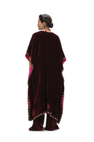 Sadhya is a garnet kaftan paired with coordinated pants. The velvet textile is scalloped with real brass 'tiki' at the edges.