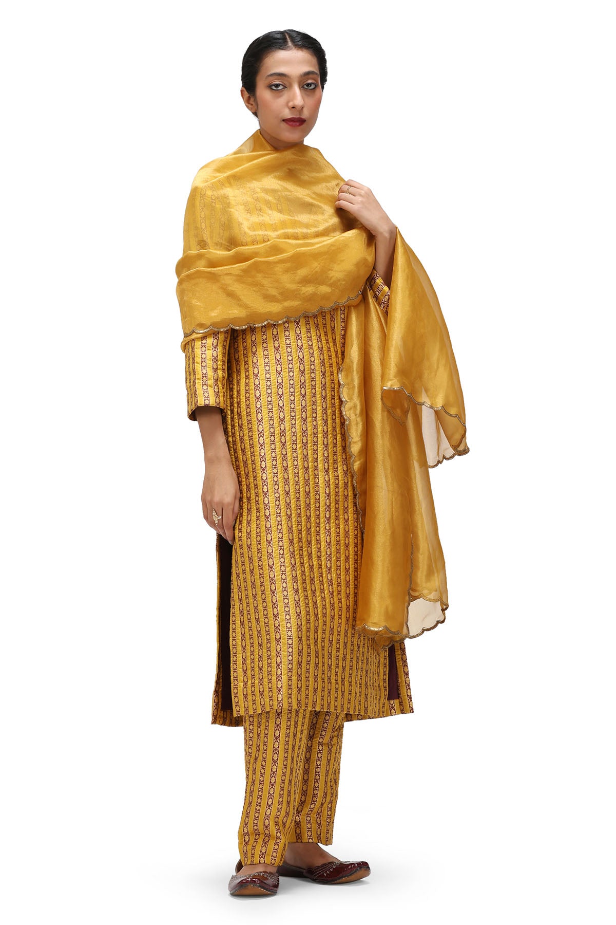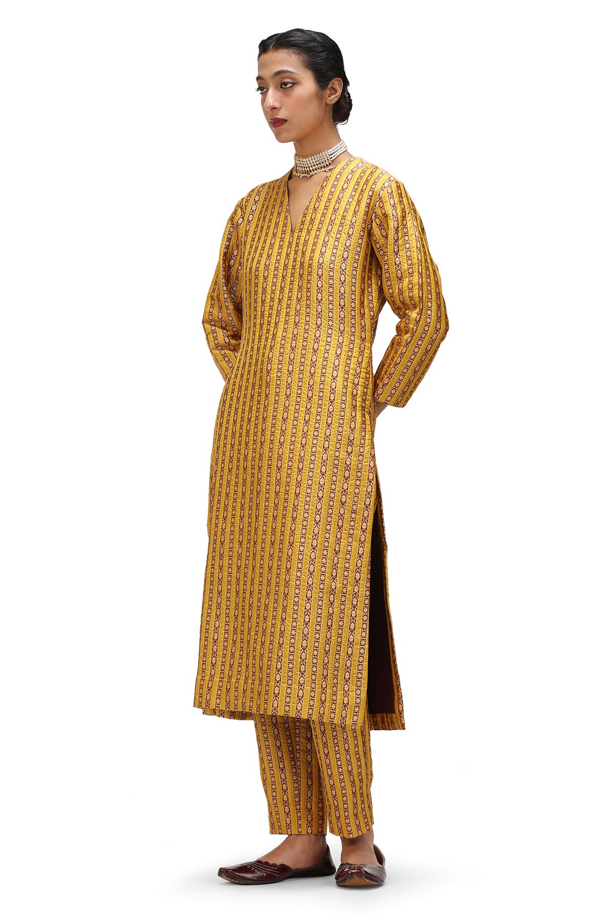 Lakika is a hand woven brocade kurta paired with coordinated pants. The textile has mustard 'zameen' with garnet and gold 'patti' brocade work.
