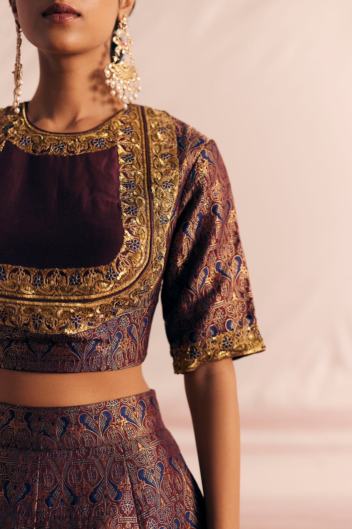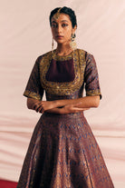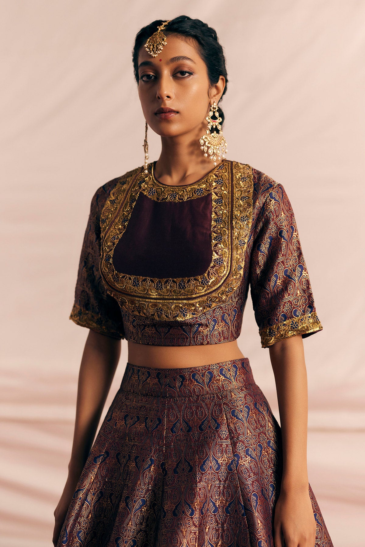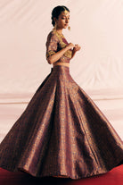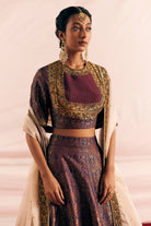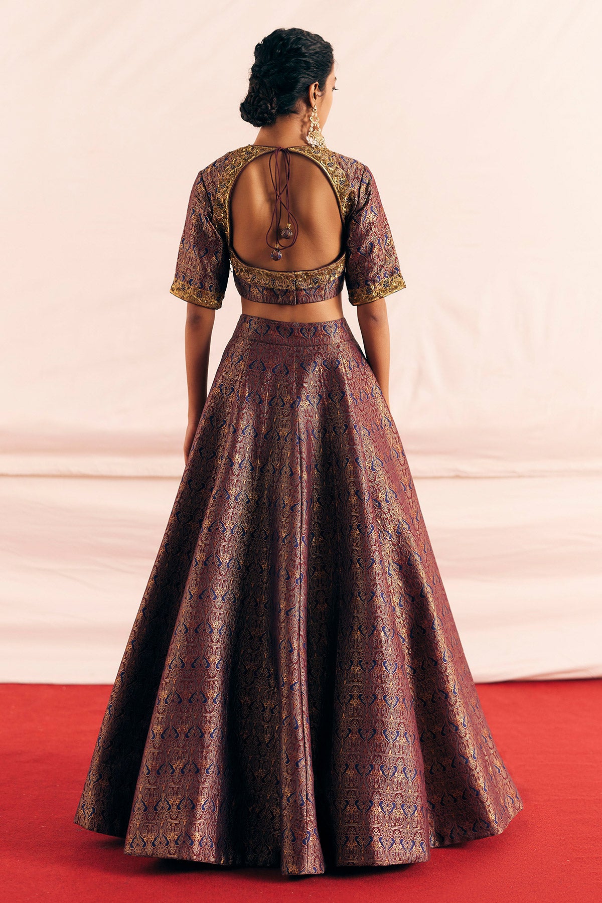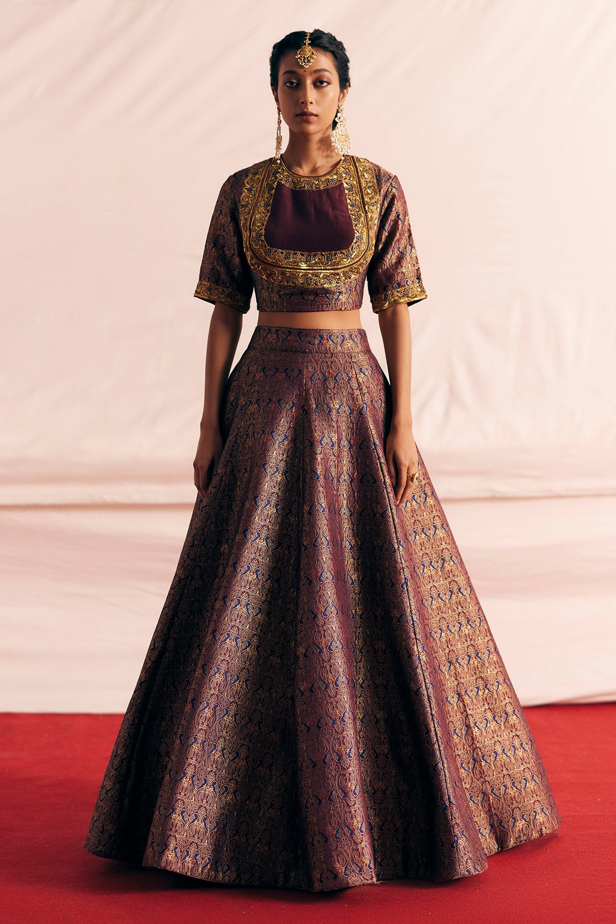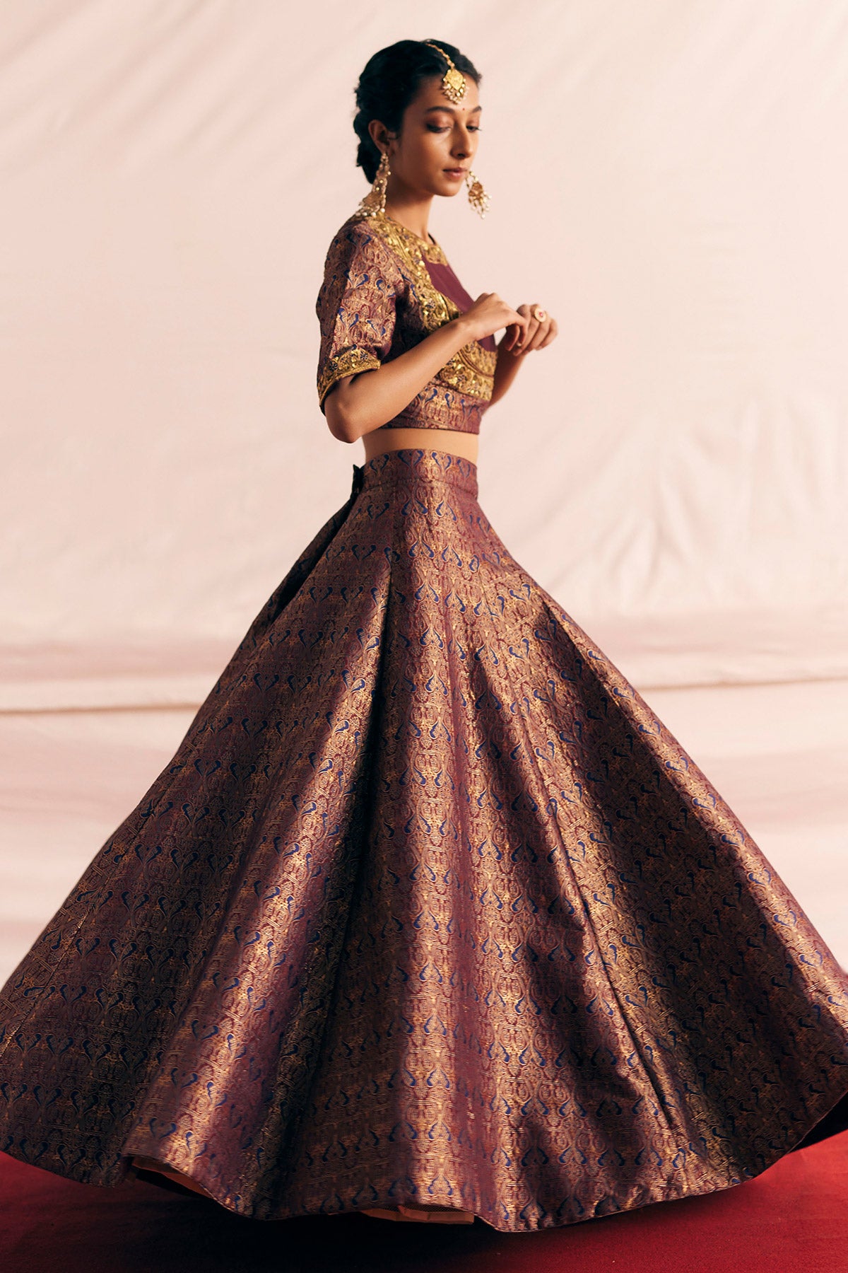 Intricately handwoven lehenga set with embroidery detailing paired with blouse and dupatta.