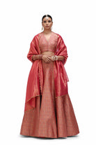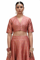 Soma is a hand woven brocade lehenga paired with coordinated blouse. The textile has 'alfi' motifs on garnet 'zameen'.