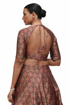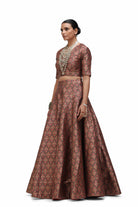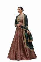 Warhi is a hand woven brocade lehenga paired with coordinated blouse. The textile has 'alfi' motifs in green and gold.