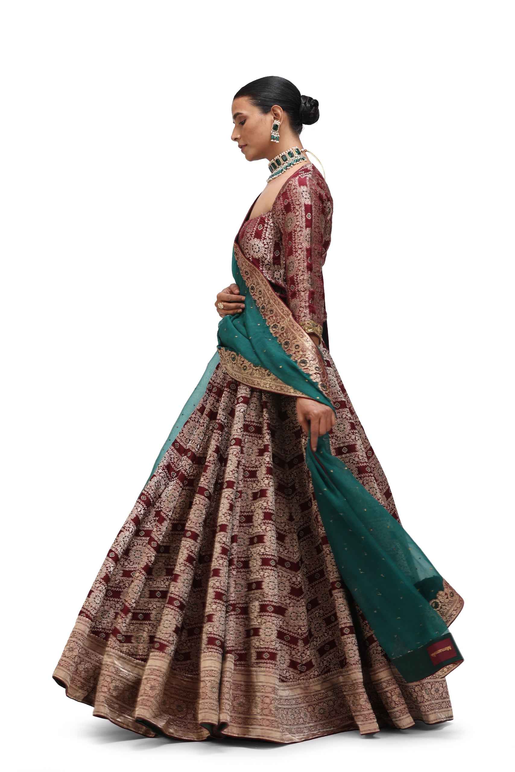 Ishanika is a hand woven brocade lehenga paired with coordinated blouse. The textile has marigold motifs on garnet 'zameen'.