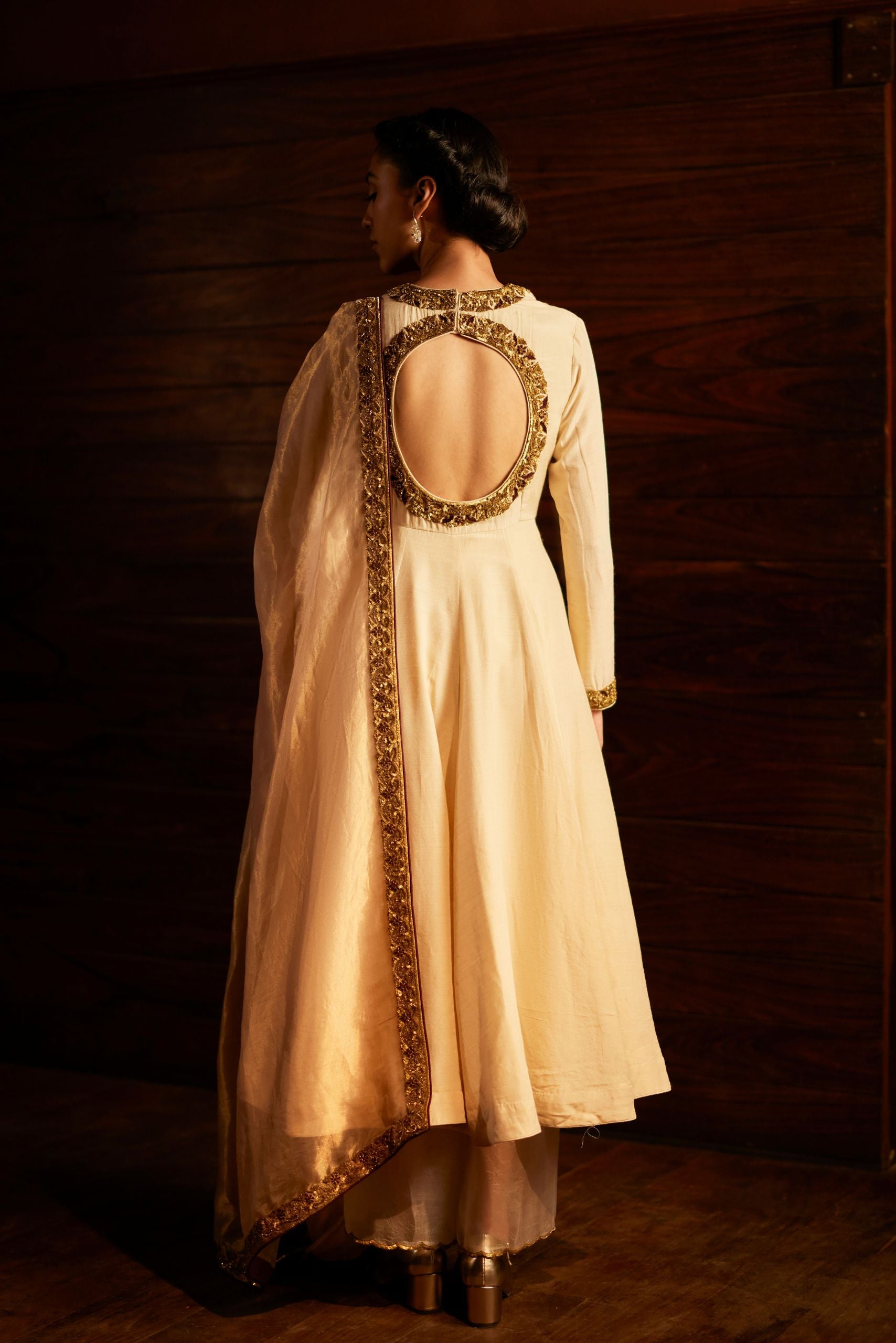 Intricately handwoven kurta set paired with dupatta in ivory.