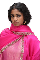 Simonil s a flowy matte dupatta in magenta. The textile is adorned with floral motifs and golden embroidery on the edges.