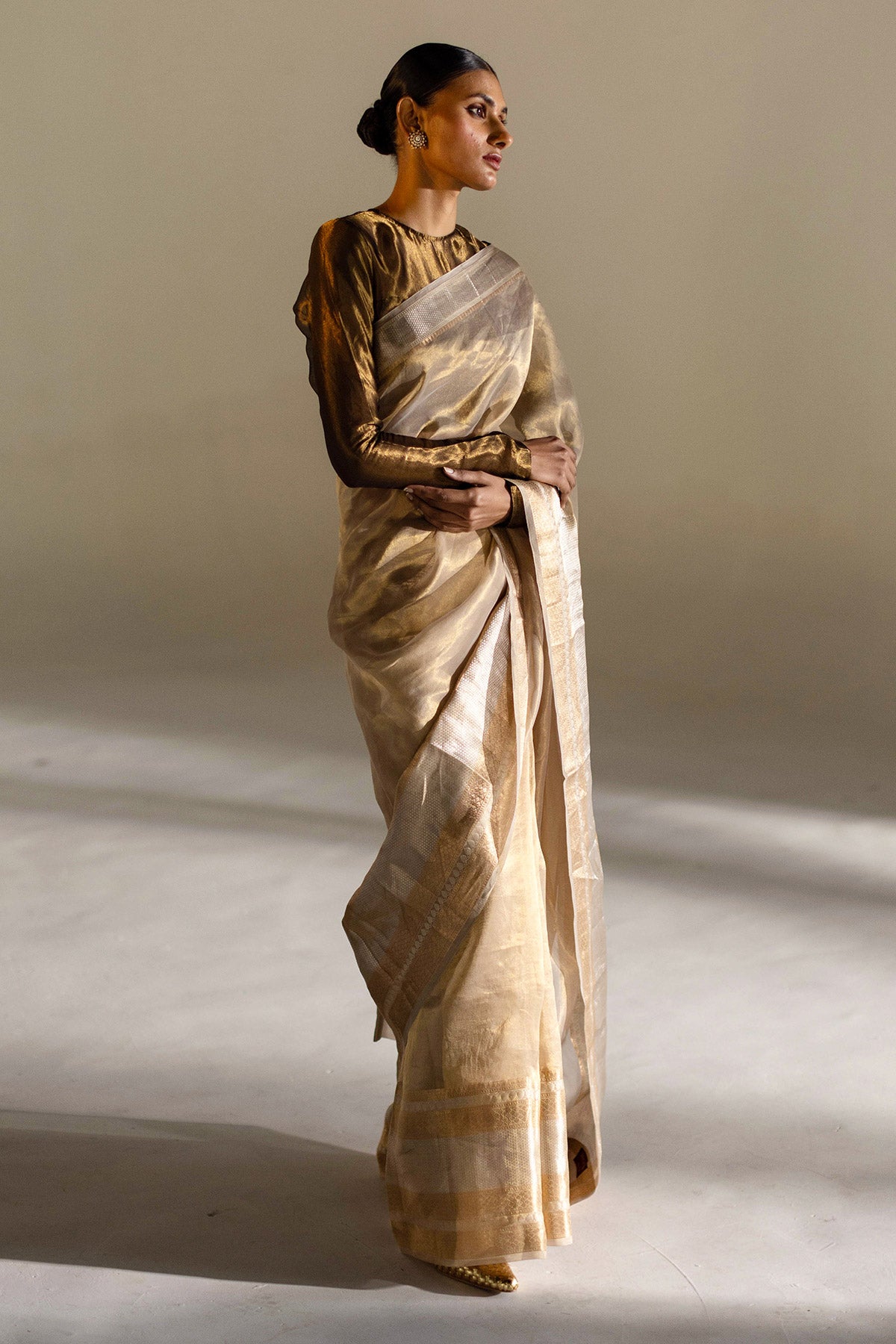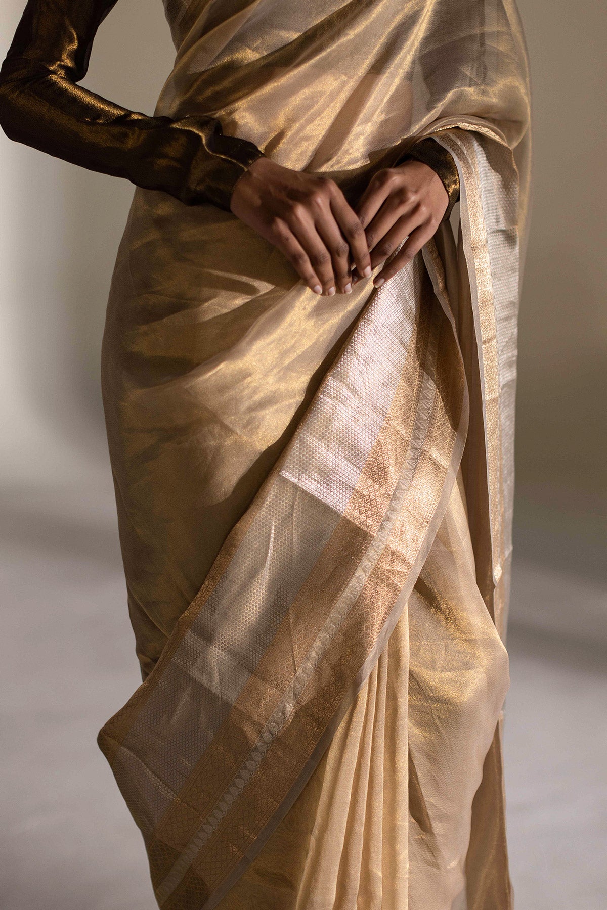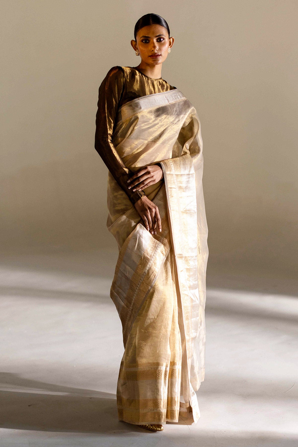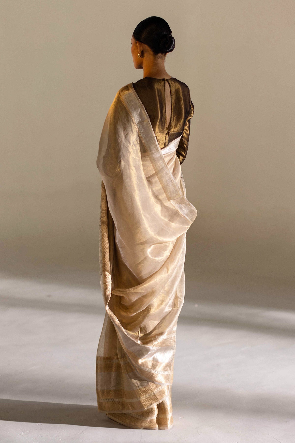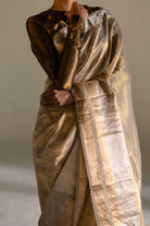 Experience elegance with COCO, a hand-woven saree in ivory.