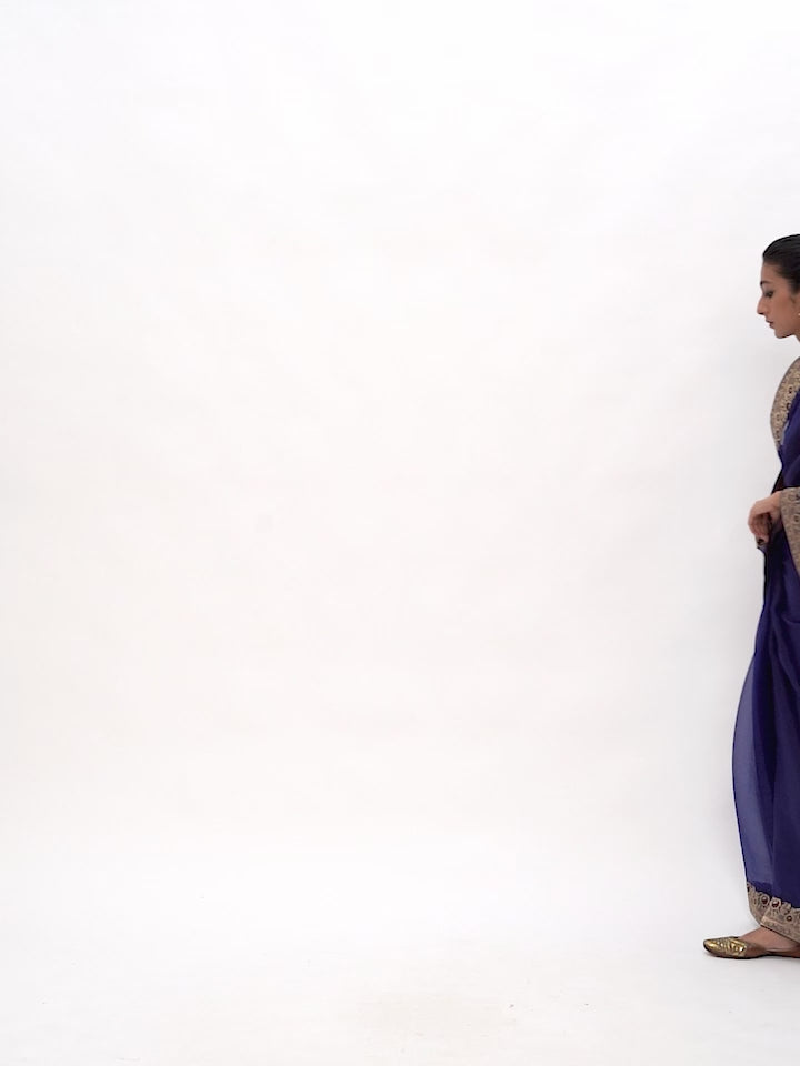 Husna is a woven and embroidered saree in deep blue embellished with appliqued brocade border.