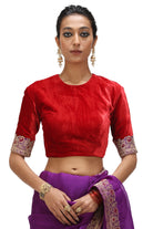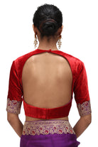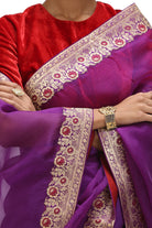 Jagyi is a woven and embroidered saree in purple embellished with appliqued brocade border.