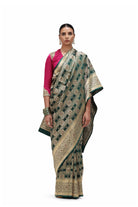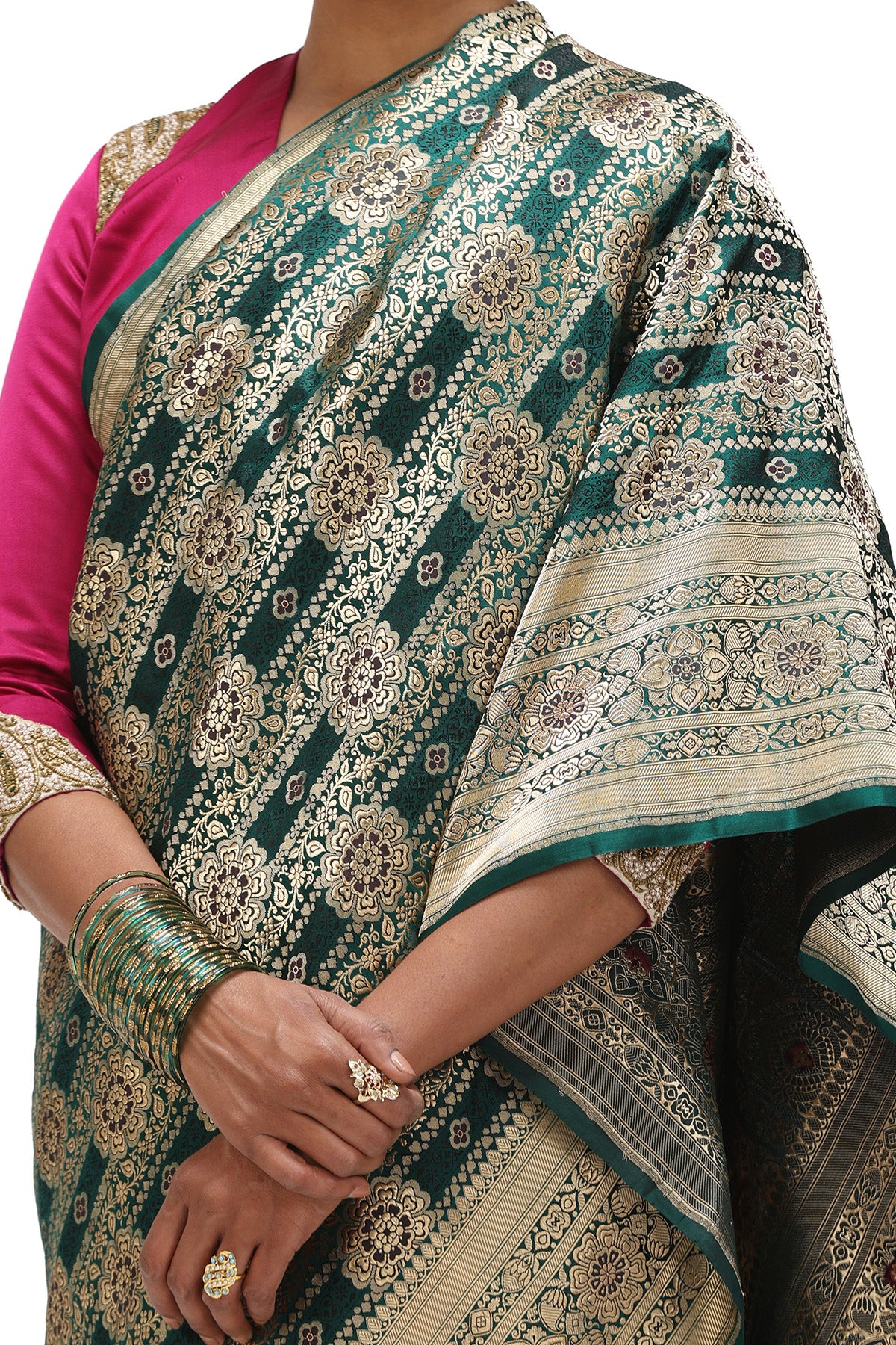 Parshee is a heavy bridal 'jaal' saree in emerald green. The textile base is satin silk with brocade 'zari' and 'mina' flower motifs using 'fekwa' weaving technique.
