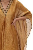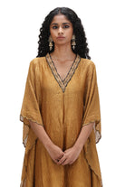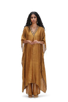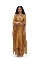 Sona is a mustard kaftan paired with coordinated pants. The fabric is scalloped with real brass 'tiki' at the edges and enhanced with 'tiki chawk'.