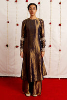 Intricately handwoven charcoal kurta and pants set paired with Dupatta.