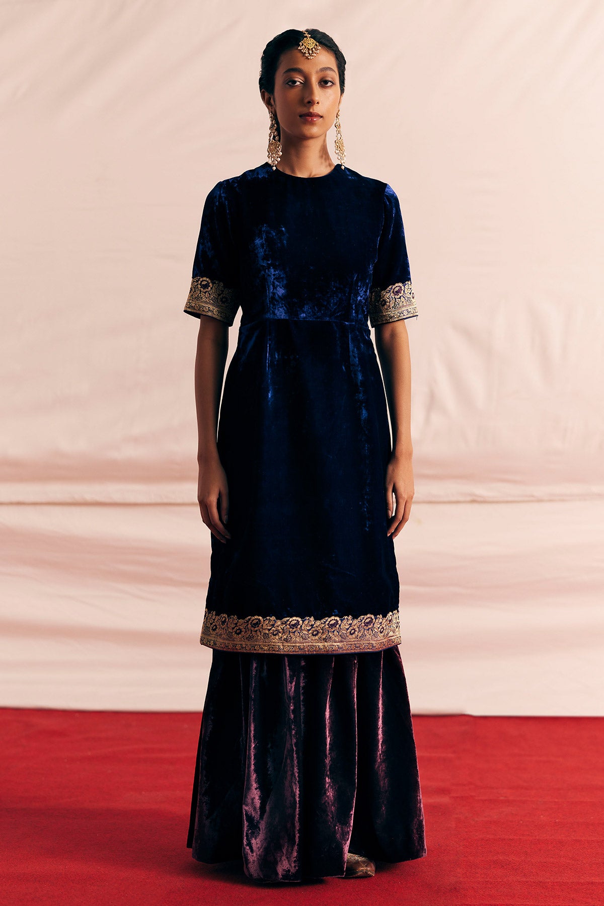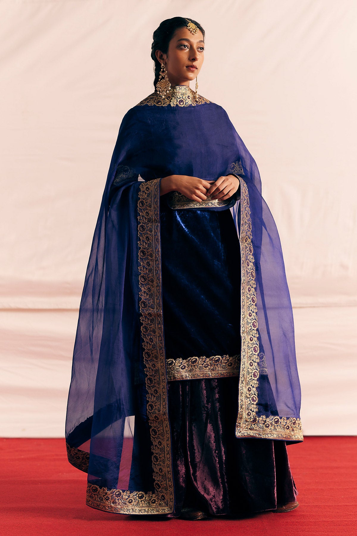 Intricately handwoven kurta and gharara set in royal blue and wine paired with royal blue dupatta.