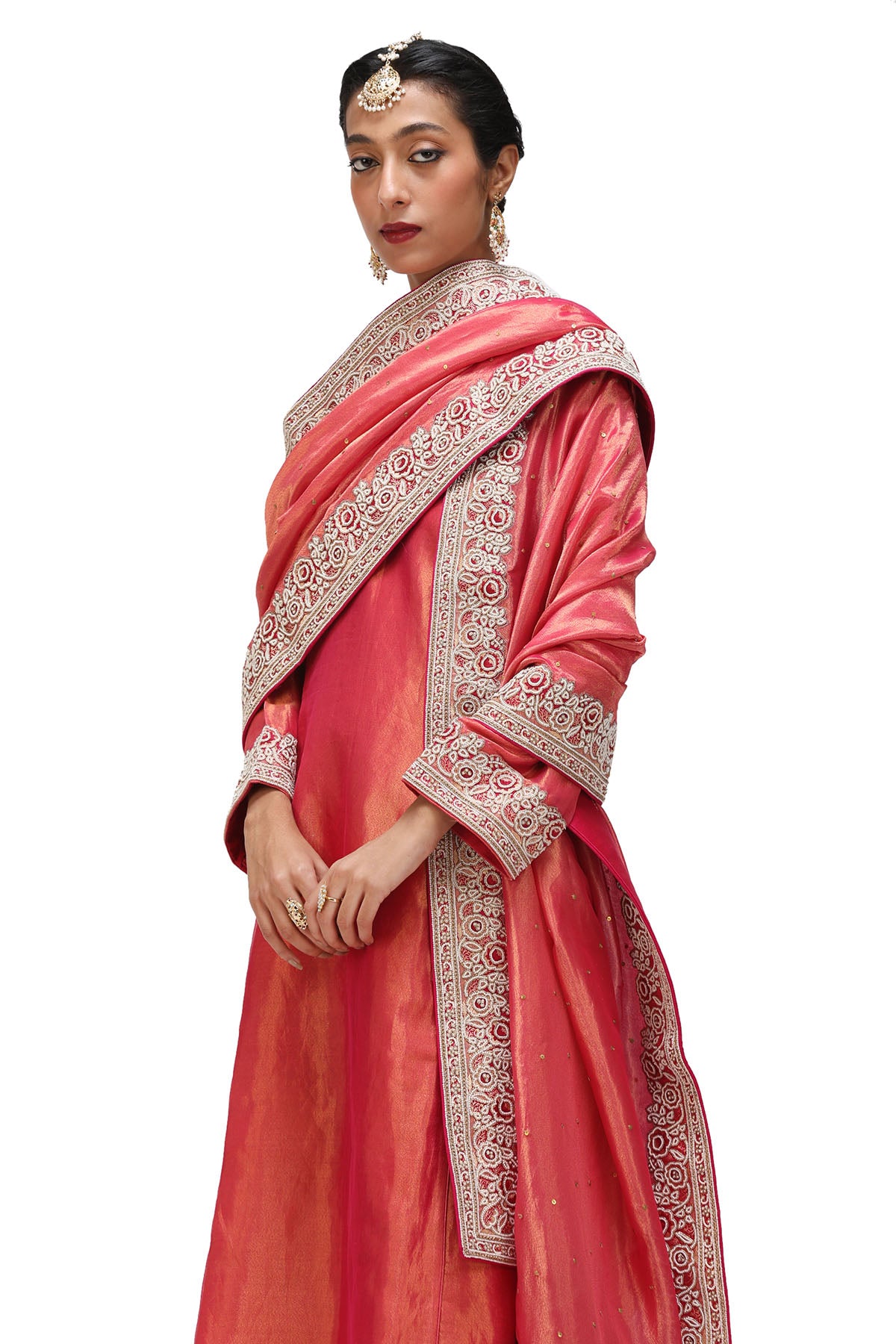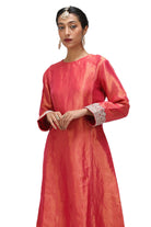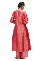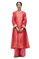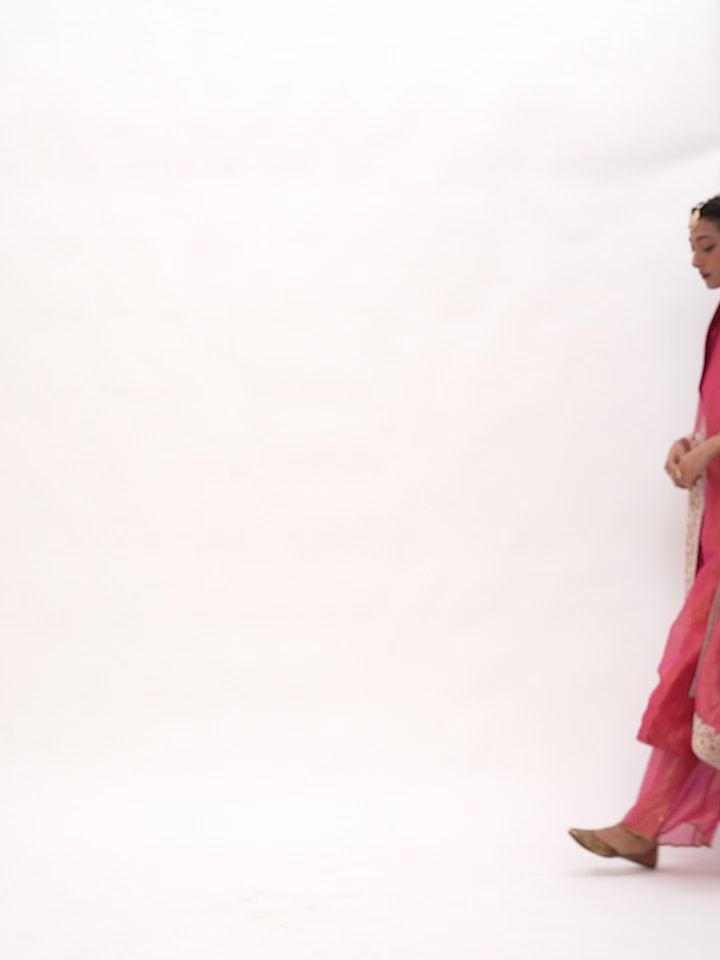 Kaur is a woven tissue silk kurta paired with coordinated pants. The textile is naturally dyed in fuchsia.
