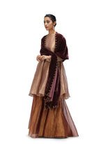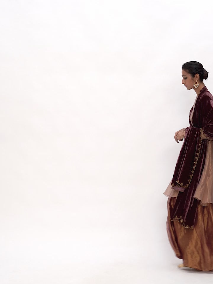 Maaya is a woven tissue silk kurta paired with coordinated pants in garnet. The textile is naturally dyed in pale.